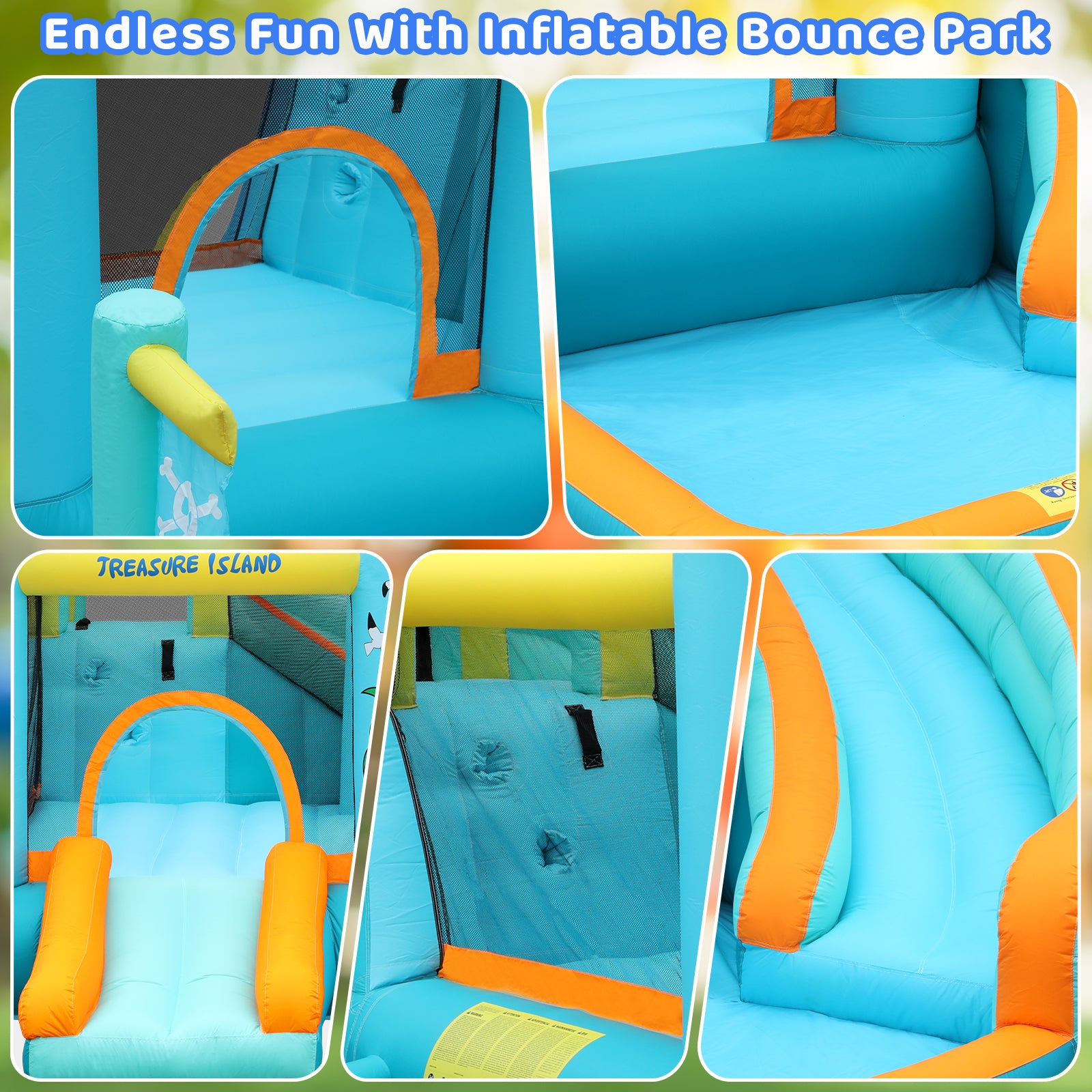 Made of durable 840D + 420D Oxford fabric, it features a jumping area, climbing wall, long slide, and splash pool. Bright colors and unique design attract kids, keeping them entertained. Comes with a 450W blower for quick inflation/deflation in under 2 minutes—perfect for indoor or outdoor fun.