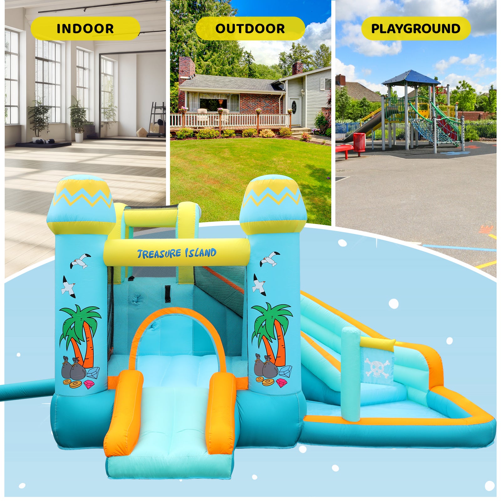- Summer Cool & Play Variety: Features 2 slides (long to pool, short to ground), climbing wall, bounce area. Kids stay cool in the splash pool while enjoying diverse games.