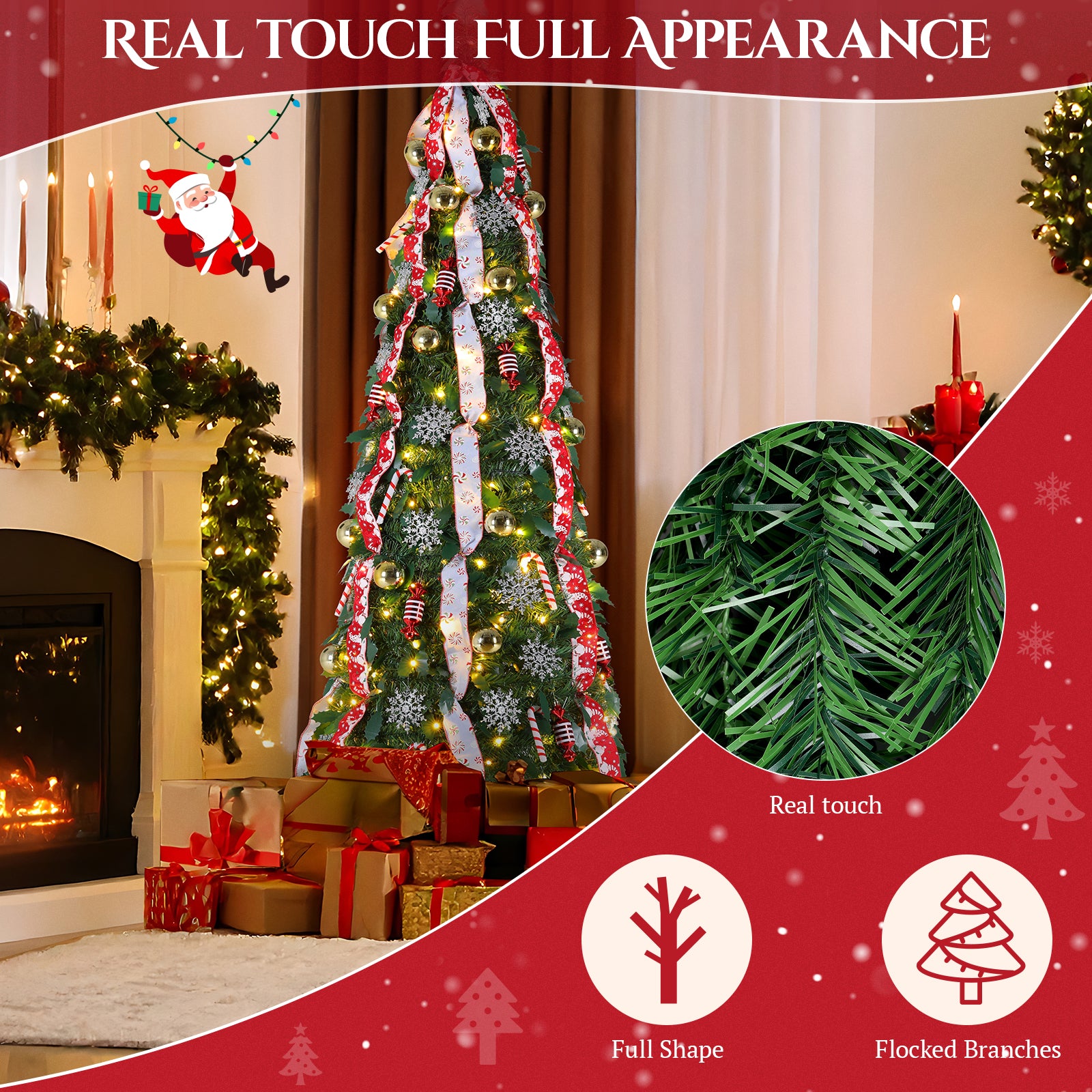 - Pre-Lit Decor & Easy Install: Pre-decorated with 8 gold balls, 8 candy balls, 4 snowflakes, 4 ribbons, 8 candies, and 100 LEDs. Features a pop-up design—attach the stand, set the tree over it, and plug in.