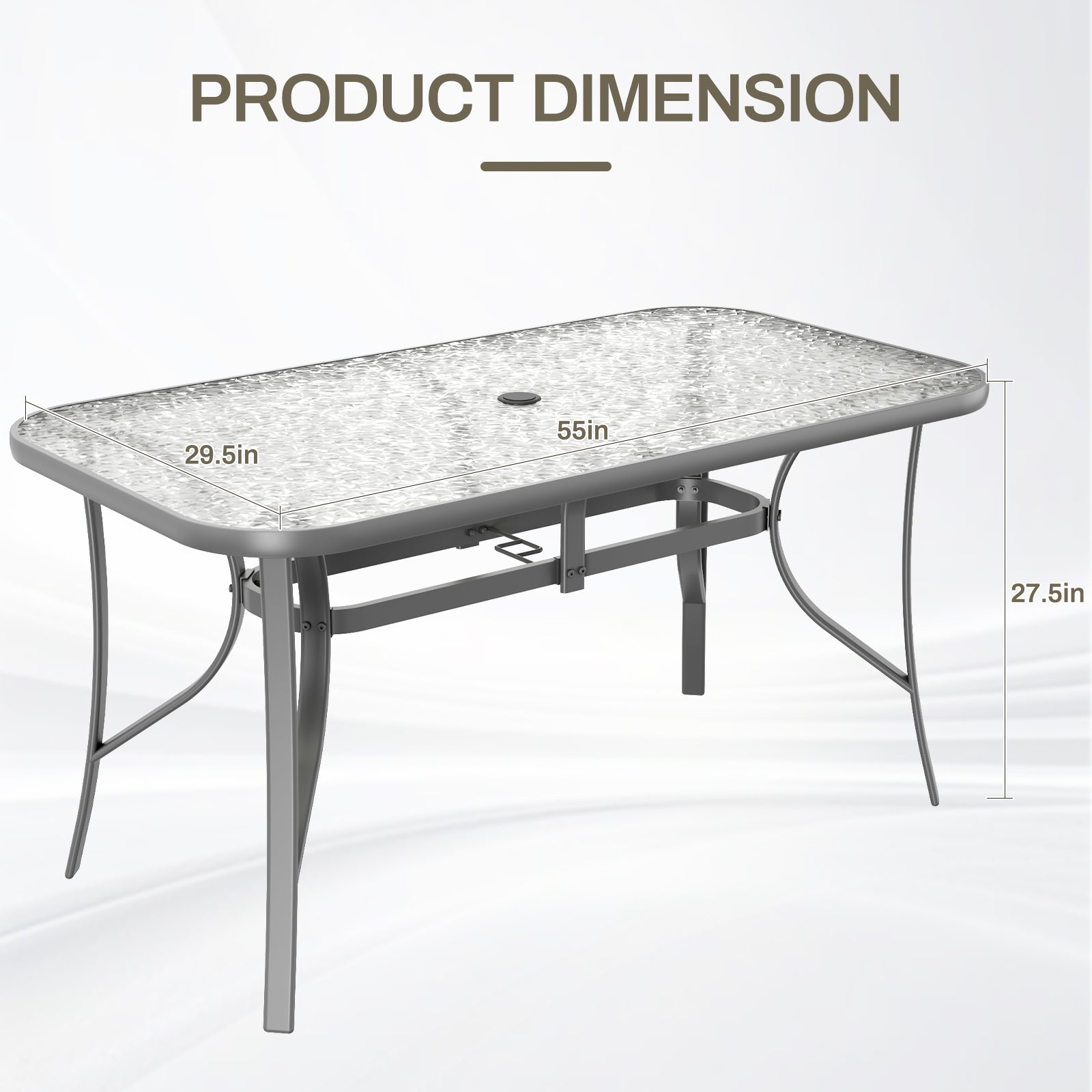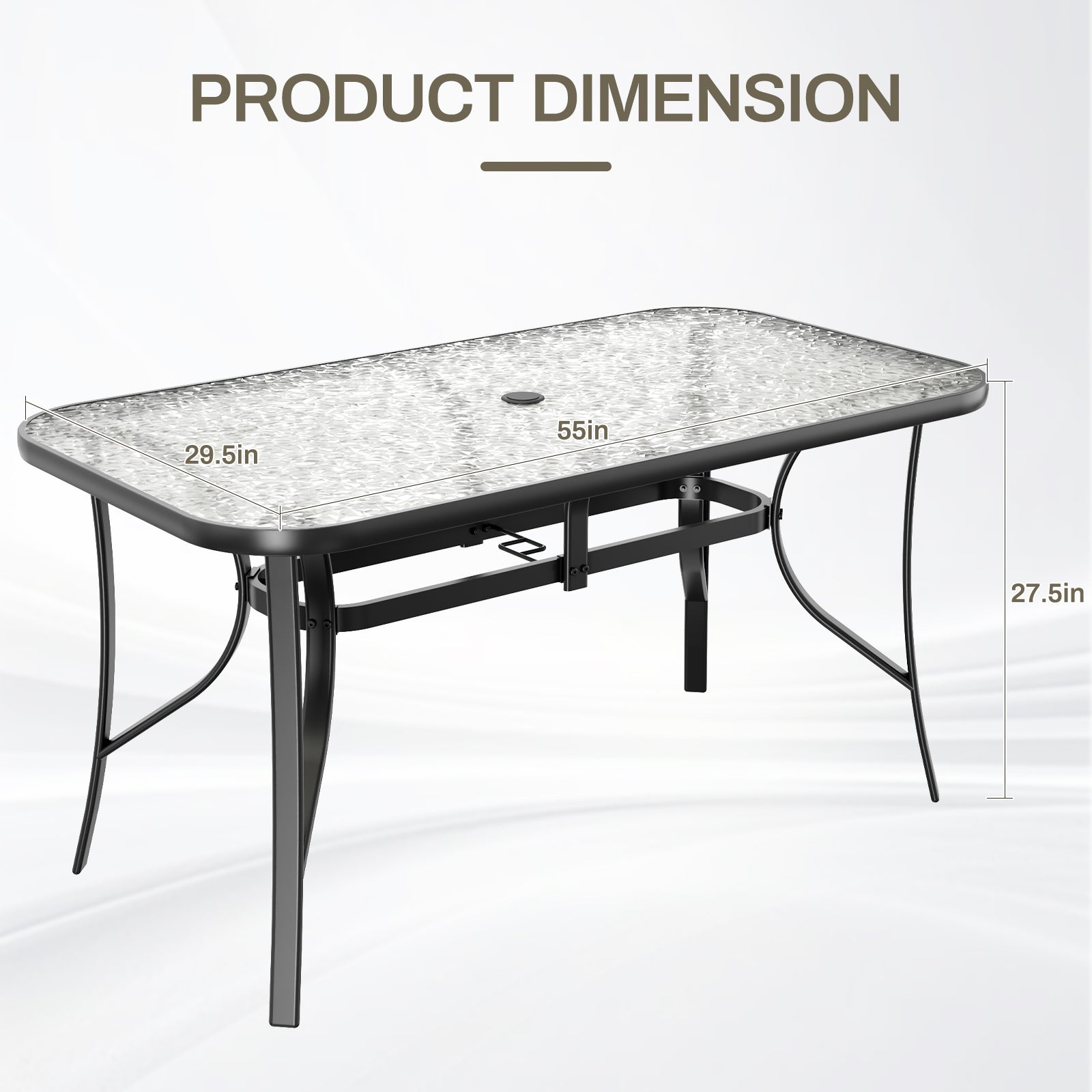 Arlopu Rectangular Patio Dining Table combines a 5mm tempered water-resistant glass top and a powder-coated steel frame, supporting up to 220LBS. It has an umbrella hole (umbrella not included) and a widened design for multi-person dining.